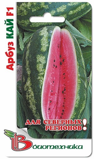 Семена арбуза "Кай" (Kaj) представляют собой специальный гибридный сорт, который подходит для выращивания на территориях с низкими температурами. Вегетационный период составляет примерно 70-75 дней. Урожай готов к сбору в августе – сентябре. Культура длинноплетистая, растет очень быстро. Плоды получаются овально-вытянутой формы. Они могут достигать массы от 7 до 10 кг. Кожура окрашена в характерный светло-зеленый окрас с продольными темно-зеленый полосками. Мякоть яркая, малиновая, сахаристая и ароматная. Белый слой очень тонкий, семян мало.