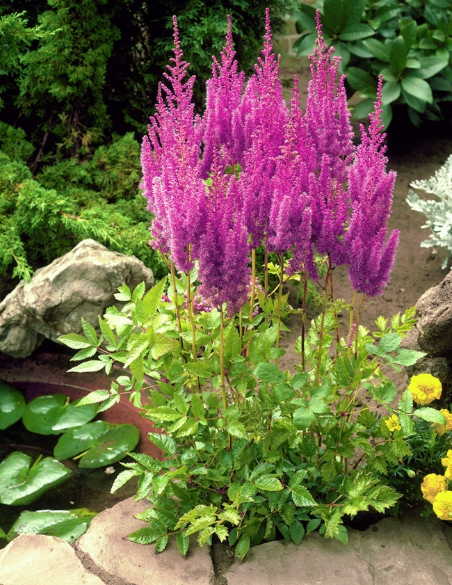 Рассада астильбы китайской Суперба (Superba) – привлекательный сорт, характерный стремящимися вверх побегами, густо усеянными розово-фиолетовыми цветками. Ажурные метелки становятся пушистыми по мере распускания сотен мелких бутонов. Черенки прямые и ровные, светло-зеленого цвета. Резная листва с зубчатыми краями расположена низко от корней. Растение идеально подходит для озеленения тенистых участков и не нуждается в особом уходе. Высота побегов в период цветения (июль-август) может достигать 1 м. Сорт хорошо размножается делением и завязывает семена. Корневую систему необходимо прикапывать осенью, чтобы защитить от морозов почки восстановления. Особенности посадки астильбы Суперба: