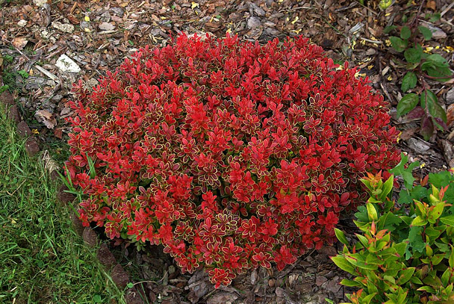 - листва – темно-красные листья с желто-зеленой окантовкой;