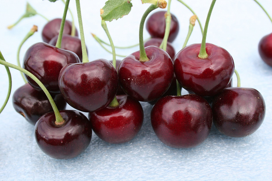 Саженцы черешни Оленька (и крупномеры) быстро достигают высокой рослости, формируют хорошую облиственную крону. С 4 года вяжут первые ягоды, достигая в течение нескольких лет урожайности в 30-40 кг с дерева. С середины июня идет созревание ягод солидного размера (до 8 г) почти черного цвета. Уровень сахаров ягод и интенсивность окраски варьируется. Мякоть не сильно плотная, с явными прожилками, благородного вкуса и аромата.