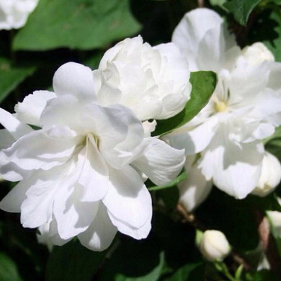 Саженцы чубушника гибридного Виргинал (Virginal) представляют собой сложный гибрид из нескольких видов кустарника. Отличается широким раскидистым кустом с сочно-зелеными листьями, который в высоту может достигать 2,5 м. Соцветия у этого кустарника очень красивые и изящные. На одной веточке собрано несколько белоснежных махровых цветков в окружении темной листвы. Аромата практически не имеет.
