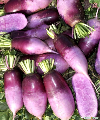 'Семена дайкона "Пурпурный самурай" знамениты не только благодаря отменному вкусу корнеплодов, но и из-за их красивейшей окраски. Кожица имеет неповторимый фиолетовый цвет. Длина корнеплодов составляет около 25-30 см. Мякоть средней остроты, очень сочная. Собирают урожай в сентябре. Семена дайкона "Пурпурный самурай" в открытый грунт высевают в середине июля. Всходы появляются на пятый день. В уходе сорт нетребователен. Нужно только регулярно пропалывать и рыхлить грядки, а также поливать их.