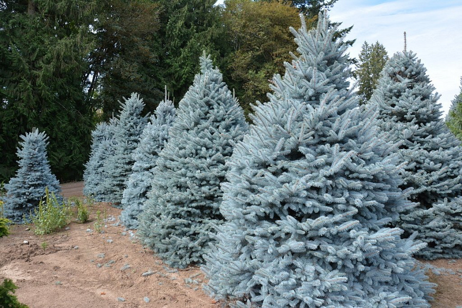 Саженцы ели голубой (Picea pungens) вырастают в живописные деревья, правильной конусообразной формы, с широкими дымчатыми «лапами» ветвей. Красивый оттенок хвое придает большое количество воскового налета. У взрослых крупномеров нижние ветки слегка ниспадают к земле, образуя вокруг широкие юбки. Высота ели голубой достигает 30м. На голубовато-зеленой острой хвое эффектно выделяются молодые оранжевые побеги. Бурые шишки в процессе созревания зеленеют, затем буреют.