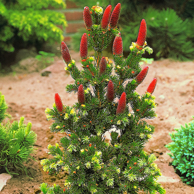 Саженцы Ели колючей Лаки Страйк (Lucky Strike) – маленькое медленнорастущее дерево, у которого крона неправильной формы конуса. Длина около 2х метров. Ель имеет щетинистую, глянцевую, хвою темно-зеленого окраса, длина которой 2-3- сантиметра. У растения изогнутые ветви и большие лилово-красные шишки, которые позже становятся коричневыми. Ель колючей Лаки Страйк любит свет, дренированный грунт, песчаные, супесчаные, плодородные, слабокислые почвы. Дерево устойчиво к морозам, дыму и ветрам. Переносит обрезку. Не переносит переувлажнения и уплотнения почвы. Подходит для аллей, каменистых садов, создания сезонных композиций и одиночной посадки.
