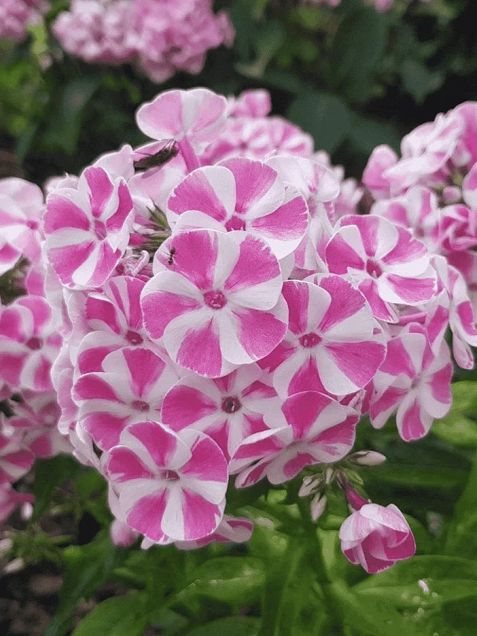 Цветки флокса белые с широкими розовыми полосами, что придает им особую изысканность и неповторимость. Листья зеленого цвета создают прекрасный контраст с яркими цветами, делая растение еще более привлекательным.