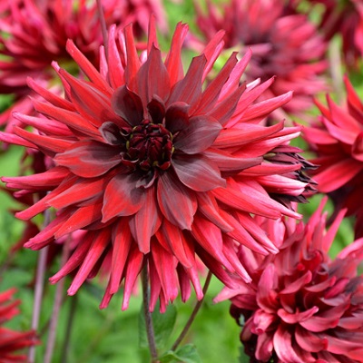 Георгин Крев Кёр – яркий представитель семейства Макси. Он полностью оправдывает сей почетный статус, из года в год выдавая многочисленные соцветия исполинских размеров. Мощный и пышный куст с сильно разветвленными полыми побегами. Практически каждый побег заканчивается махровым соцветием сочной и равномерной красной расцветки. Цветы состоят из невообразимого количества плоских и широких лепестков, заостряющихся в конце.