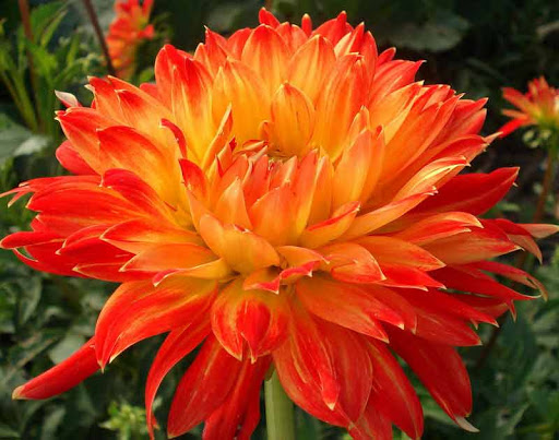 Крупномеры георгины махровой Процион (Dahlia variabilis Procyon) ― невероятно красивые и декоративные растения. Их отличают очень яркие и пышные соцветия. Собранные густо в шар лепестки с рассеченными кончиками оранжево-желтого цвета, украшают красные пятнышки по краям. Георгина отличается от аналогичных обильным и продолжительным цветением с начала лета до самого октября. Диаметр одного цветка в максимально распущенном состоянии достигает 15 сантиметров. А сам куст может превысить один метр в высоту, что стоит учитывать при выборе места для его посадки. Подходит как для одиночной посадки, так и для использования в группах.