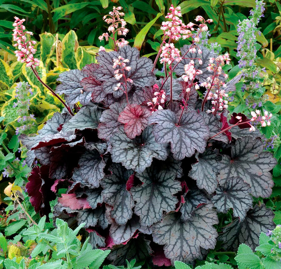 Рассада гейхеры Дарк Мистери (Dark Mystery) украсит любую смешанную клумбу или послужит материалом для эффектной одиночной посадки. Особенностью сорта является необычная форма и расцветка листвы: гофрированные листья имеют пурпурно-коричневую окраску. На протяжении всего лета растение цветет мелкими кремовыми цветочками.