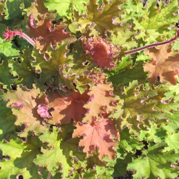 Рассада гейхеры Кассандра (Kassandra) будет отлично смотреться среди папоротников и хост. Этот необычный сорт на протяжении сезона меняет окраску: при формировании листва темно-красная, а затем становится зеленой, желтой, оранжевой и коричневой. В начале лета из розетки пробиваются длинные стебли с нежными белыми соцветиями.