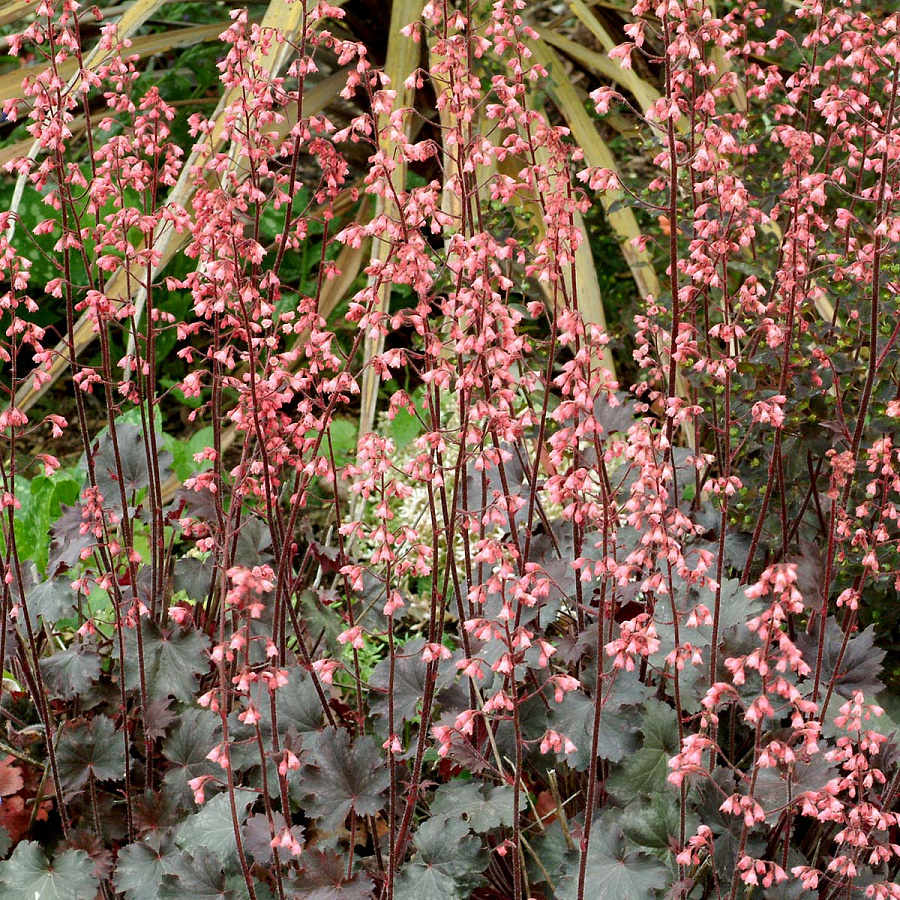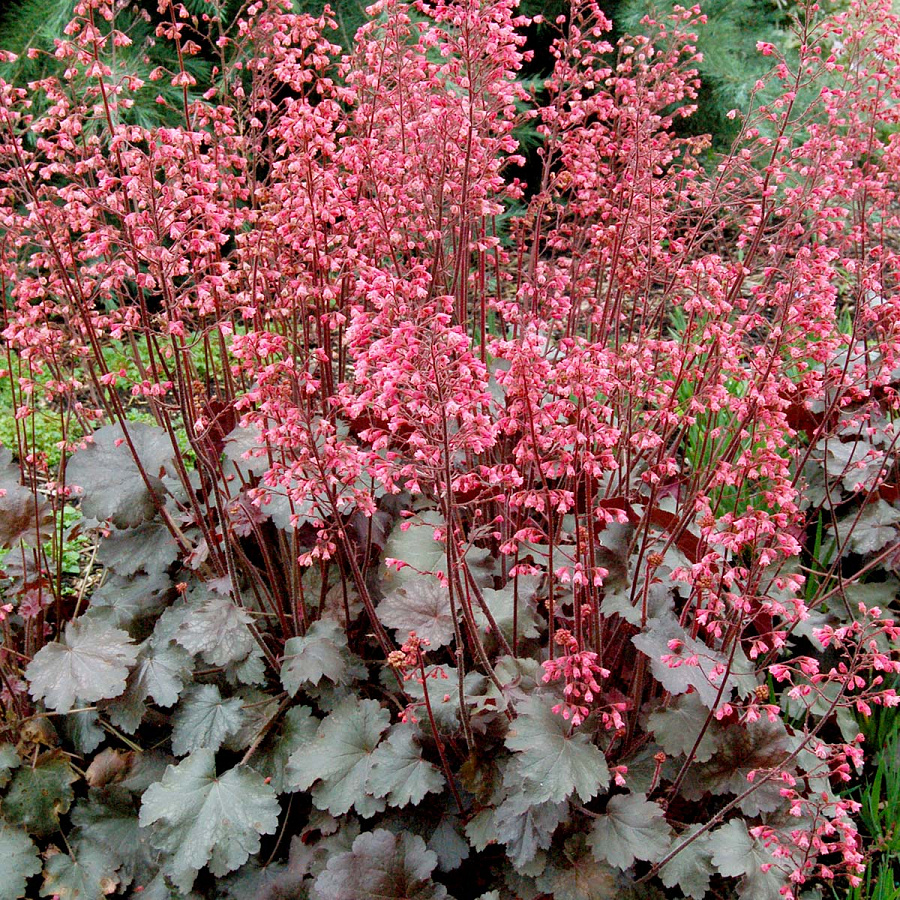 Рассада гейхеры Везувий (Vesuvius) украсит садовые посадки темно-бордовыми бархатными листами. Летом эффектный вид растения дополняется многочисленными красными цветками, которые распускаются на длинных стебельках. Этот сорт отлично сочетается с лилейниками, геранями и декоративными злаками.