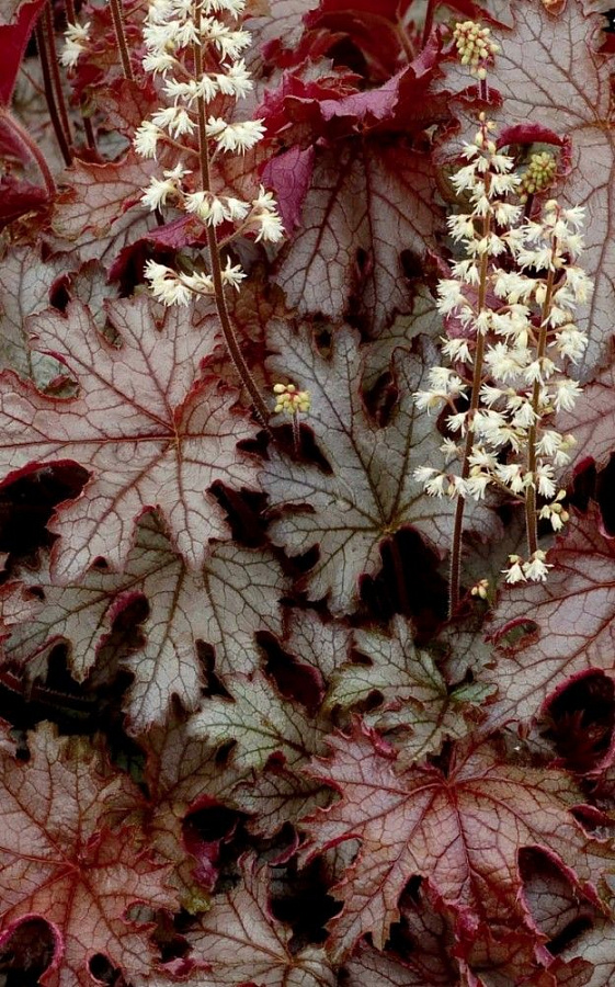 Рассада гейхереллы Кракед Айс (Chacked Ice) выглядит очень эффектно благодаря темным прожилкам, контрастно проступающим по синевато-зеленой поверхности листвы. Во второй половине лета и без того привлекательный вид дополняется цветоносами с мелкими розовыми цветочками. Этот сорт прекрасно сочетается с геранями, лилейниками и астибальдой.