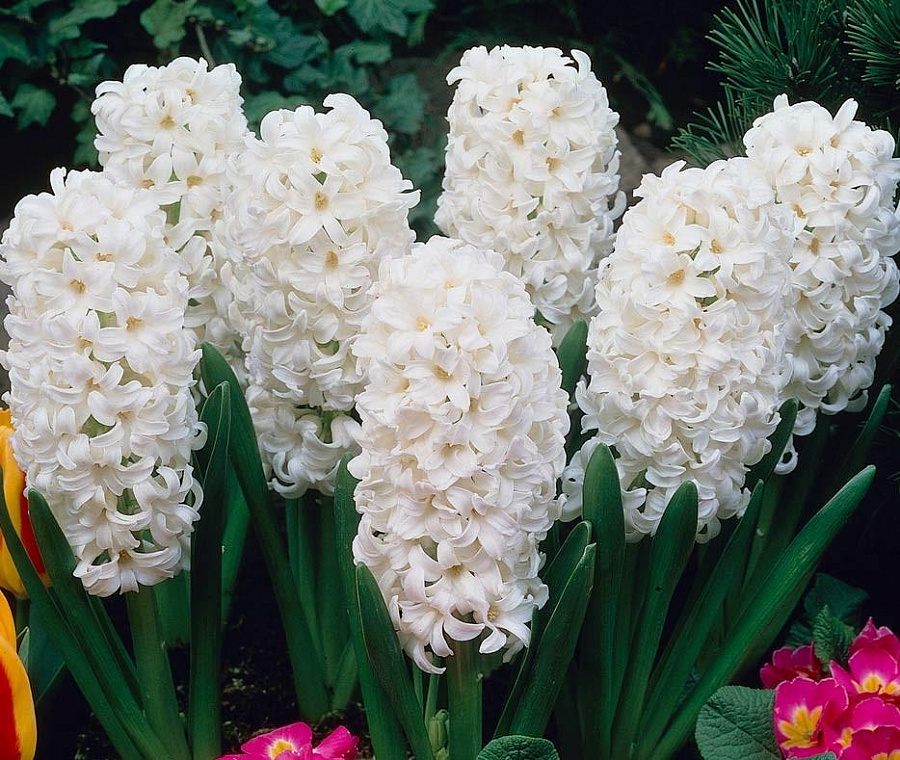 Луковицы гиацинта Карнеги (Carnegie) просты в выращивании и весной дарят саду притягательные белые кисти из ароматных цветов. Плотный зеленый стебель покрывается нежными белыми звездами. Цветущее растение завораживает на клумбе и прекрасно смотрится в срезке. С виду хрупкая, но плотная зеленая листва выгодно оттеняет объемные вертикальные кисти.