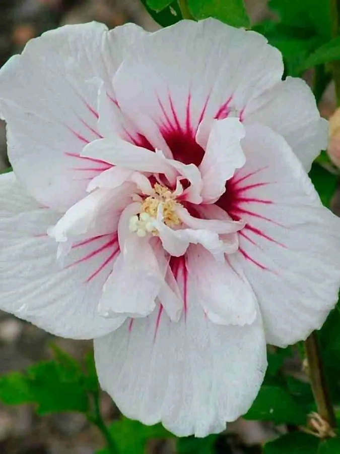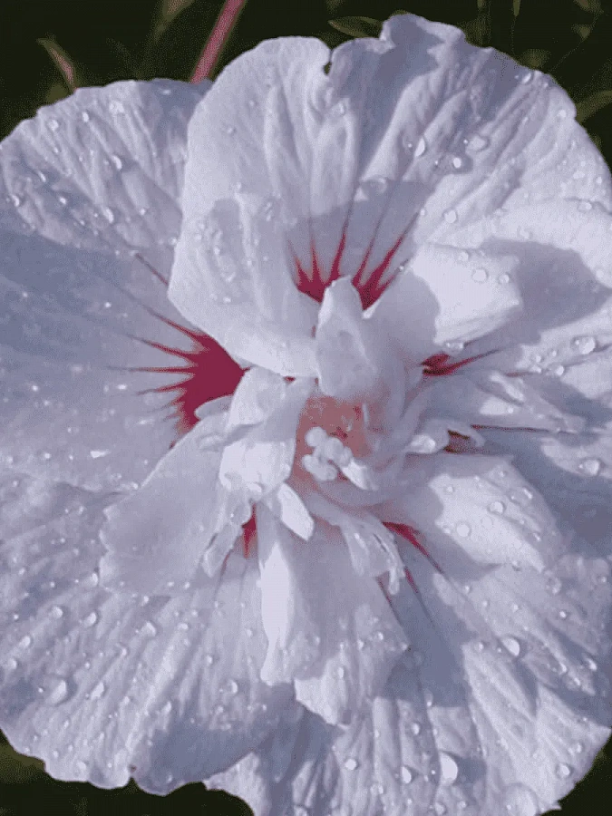 Окраска цветка : белая с розовым, в центре с яркими красно-малиновыми лучами