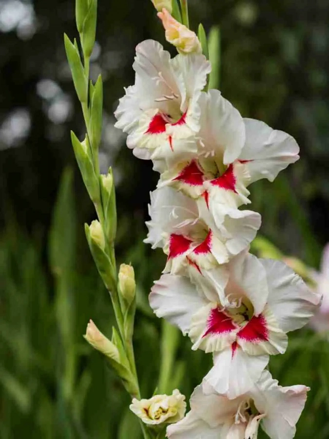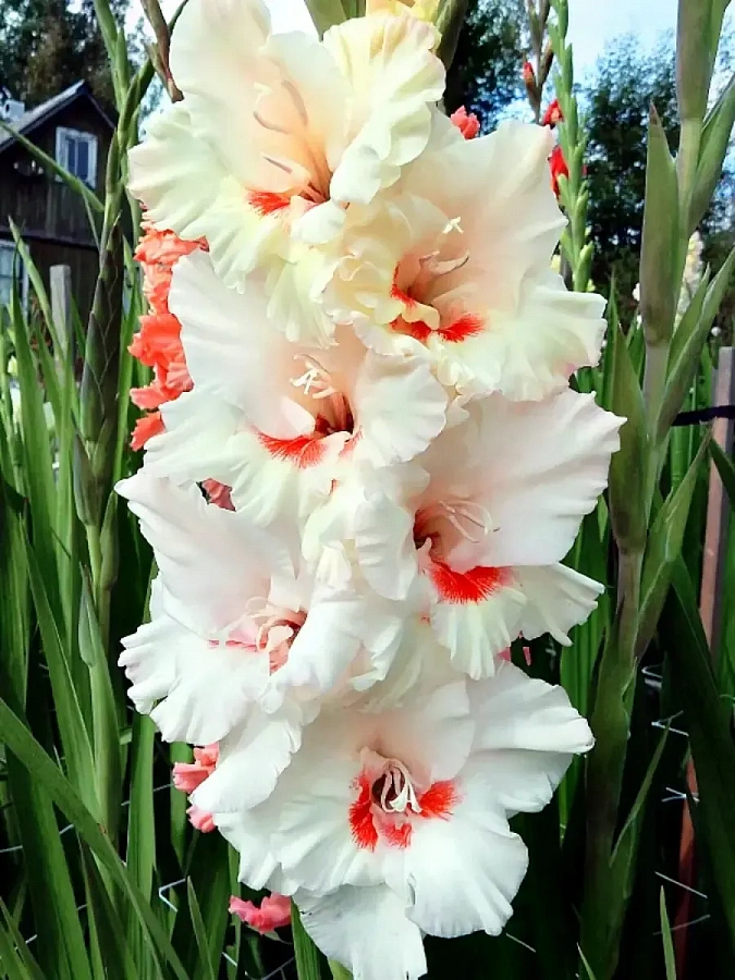 Луковицы гладиолуса гибридного Аджакс (Ajax) - гарантия сортовой чистоты и качества посадочного материала. С наступлением теплой погоды и прогреванием грунта высаживайте луковицы на открытых солнечных местах. Предпочтительные грунты - песчаные и супесчаные, лунки мульчируйте органикой. Сорт характерен высокими прямостоячими стеблями, высотой до 1 метра, длинными мечевидными листьями. Соцветие образуется двумя рядами цветов молочно-белого или бежевого тона с яркими кровавыми мазками в центре. Края лепестков украшает широкая гофрированная кайма.