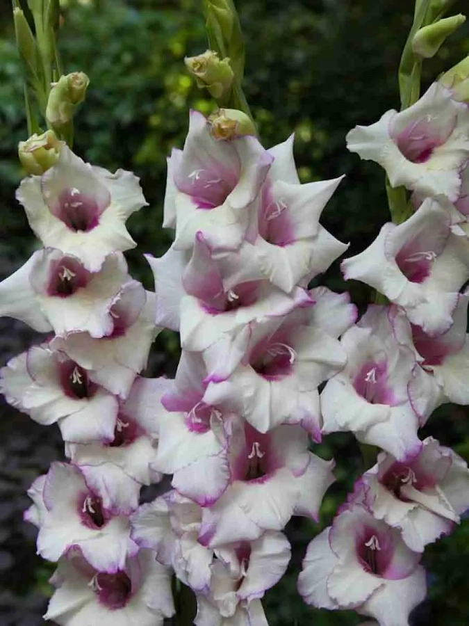 Луковицы гладиолуса гибридного Кондор Паса (Condor Pasa) порадуют цветоводов нежными, привлекательными бутонами уже через 3 месяца после посадки. Изящное, высокое растение, по форме напоминающее устремленный ввысь меч, украсит любой садовый участок или околодомовую территорию. Особенности сорта: цветет сразу несколькими (около 5-8 штук) бутонами, расположенными по бокам стебля, с середины июля до августа. Расцветка благородная молочно-белая с характерными прожилками сиреневого цвета. Растение солнцелюбивое, неприхотливое. Идеально подходит для создания букетов.