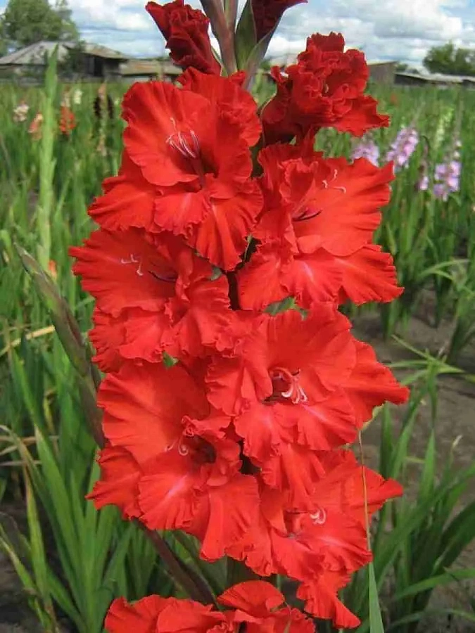 Луковицы гладиолуса гибридного Файер Раффл (Fire Ruffle) украсят ваш участок ярким оттенком цветущих бутонов. Растение эффектное, предназначено для высадки в открытом грунте на солнечных участках. Во время цветения требовательно к поливу. Высота этого сорта гладиолуса около 1 метра, средний диаметр цветка – 12 сантиметров. Бутоны яркие, насыщенного красного оттенка, видны издалека. Цветет долго, начиная с июня и заканчивая к сентябрю. Цветок идеально подходит для произрастания на клумбах, желательно на втором плане, чтобы не перебивать вид яркой расцветкой. Хорош в букетах.