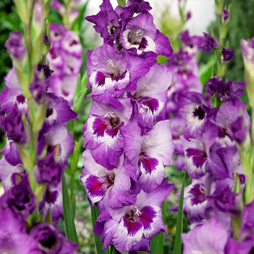 Гладиолус крупноцветковый Виста - это великолепное растение с нежно-лиловыми цветками, переходящими в белоснежный центр и украшенными темно-бордовыми пятнами. Этот гладиолус поражает своей красотой и изяществом, привлекая внимание своими крупными цветками размером от 15 до 18 см. Высота растения достигает 110-130 см, что делает его заметным акцентом в саду или на газоне.