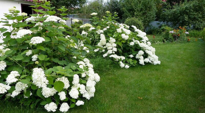 3. Соцветие метелка белого цвета. Цветки стерильные с большими чашелистиками. Для более интенсивного цветения рекомендуется ранней весной очень коротко обрезать прошлогодние побеги;