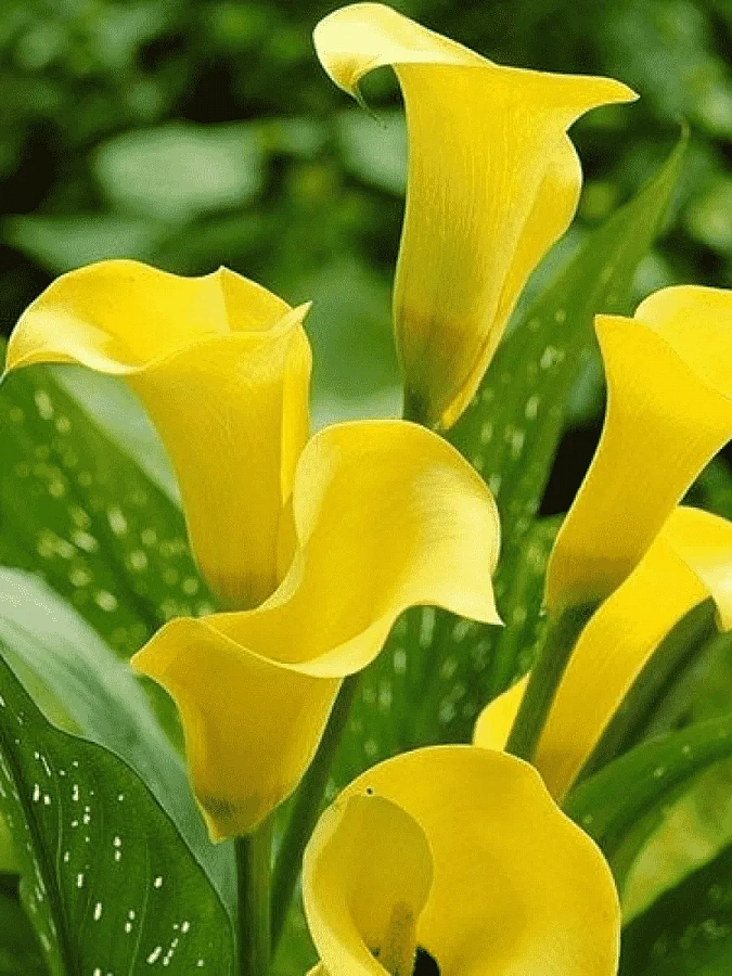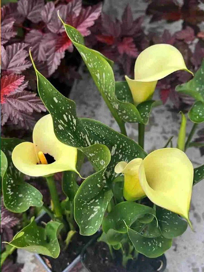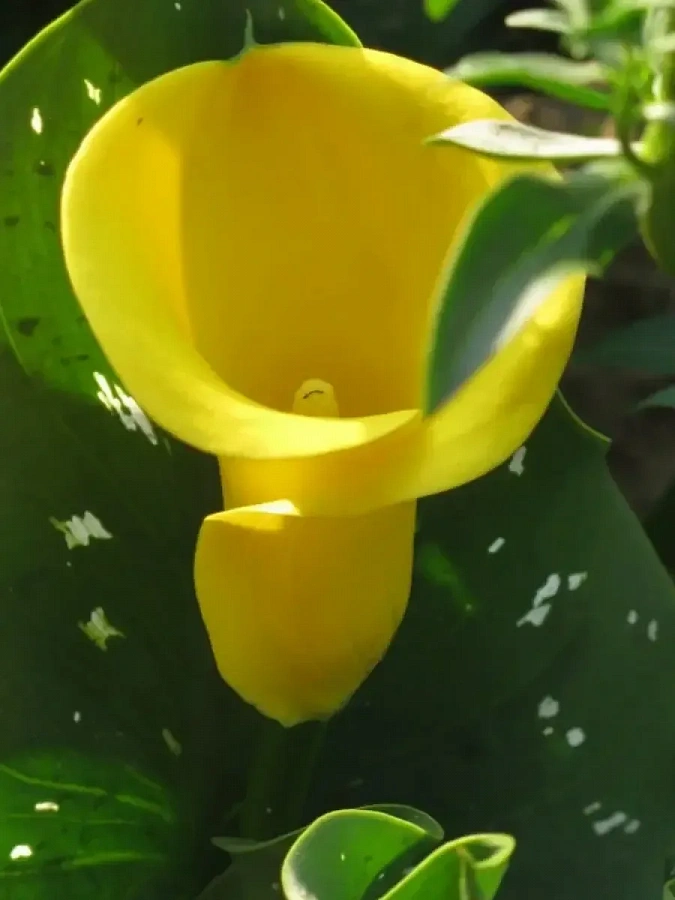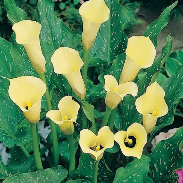 Луковицы Каллы гибридной Блек Меджик (Black Magic Calla) выпускают цветоносы с необычными цветками. По виду они такие же, как и большинство соцветий калл. Ярко-желтый початок укутан зеленовато-желтым покрывалом. Но нижняя внутренняя часть «бокала» окрашена в темно-коричневый цвет. Стреловидные листья крупные и блестящие. Они темно-зеленого цвета, покрыты серебристыми большими вкраплениями. Соцветие держится на кусте в течение 1,5 месяцев. В срезке оно простоит в первозданном виде 5–7 дней. Срезать соцветия необходимо до образования семян, тогда луковица успевает запастись питательными веществами перед зимовкой.