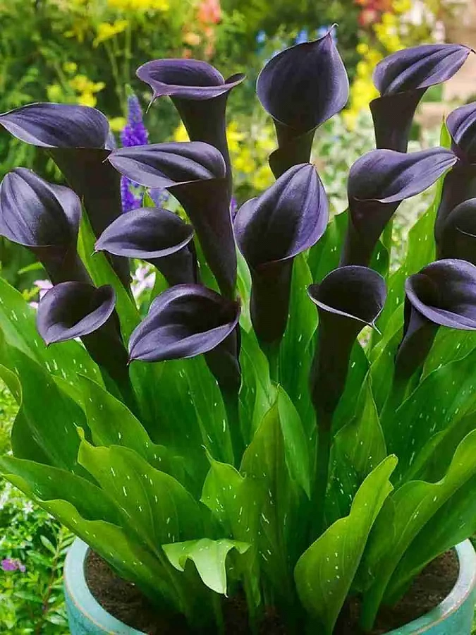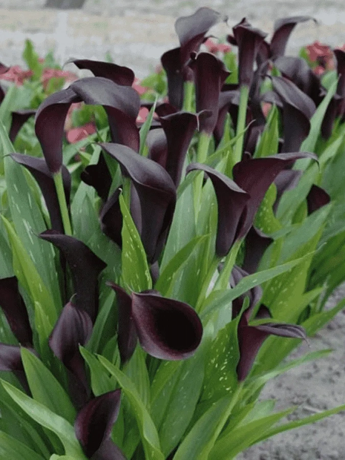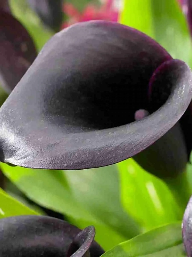 Луковицы каллы Одесса (Calla Odessa) – необычный, очень декоративный сорт с крупными ароматными цветками фиолетово-черного цвета красивой ярко-зеленой листвой с белыми вкраплениями.