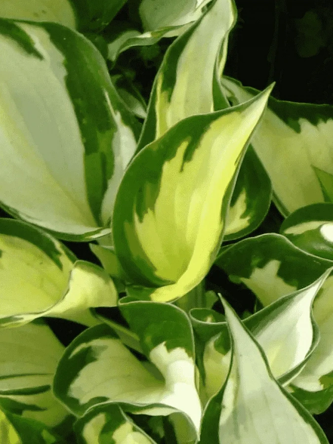 Весенняя окраска листвы : Края листьев хосты зелёные, Крупный центр в начале отрастания салатный, далее становится лимонно-жёлтым или сливочным, а при хорошей освещённости становится полностью белым