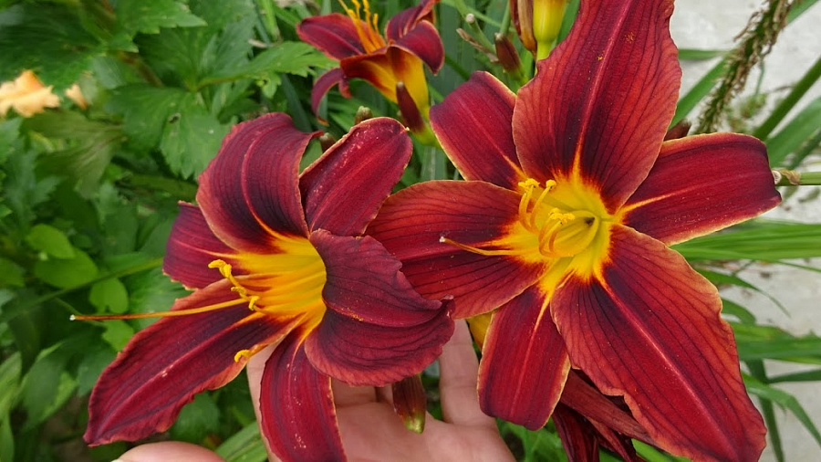 Окраска цветка : темно-бордовый с желтым горлом, диаметр цветка 12см