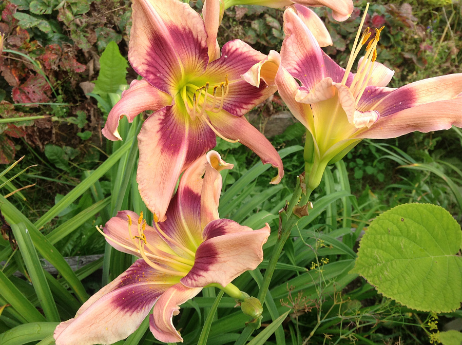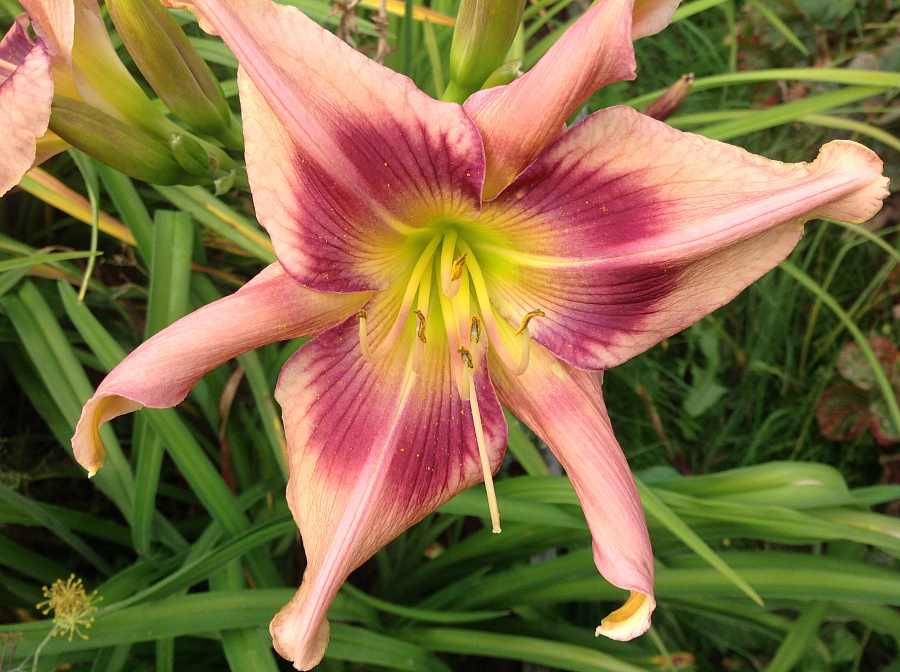 Окраска цветка : розово-абрикосовая с желтым центром и фиолетово-лилвым кольцом