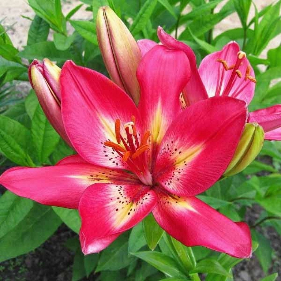 Саженцы и рассада азиатской Лилии Арсенал (Lilium asiatic Arsenal) из гибридного обильноцветущего сорта, радующего простыми и одновременно красивыми цветками, формирующимися на высоких и сильных стеблях. Крупные соцветия насыщенного розового цвета с редкими четкими вкраплениями будут акцентировать любопытствующее внимание на правильных формах и контрастной желтой середине цветка, который распускается в июне-июле. Простой уход, низкая заболеваемость, высокая морозостойкость, оперативная акклиматизация и полное отсутствие запаха – дополняют перечень положительных качеств данного сорта.
