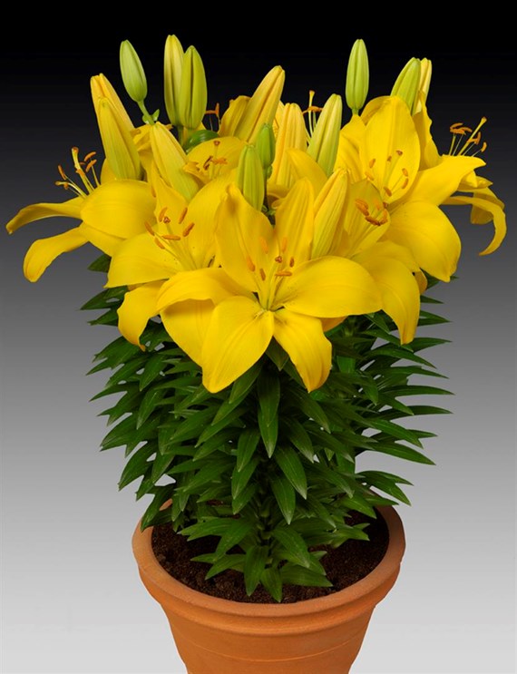 Лилия азиатская горшечная Golden Matrix - это настоящее сокровище для вашего сада! Это растение поразит вас своей красотой и изысканностью. Ярко-желтые цветы с редким темным крапом и оранжевыми пыльниками привлекут внимание всех соседей. Высота этой лилии может достигать 40-50 см, а размер цветка равен 15 см. Листья имеют интересную форму, что делает растение еще более привлекательным.