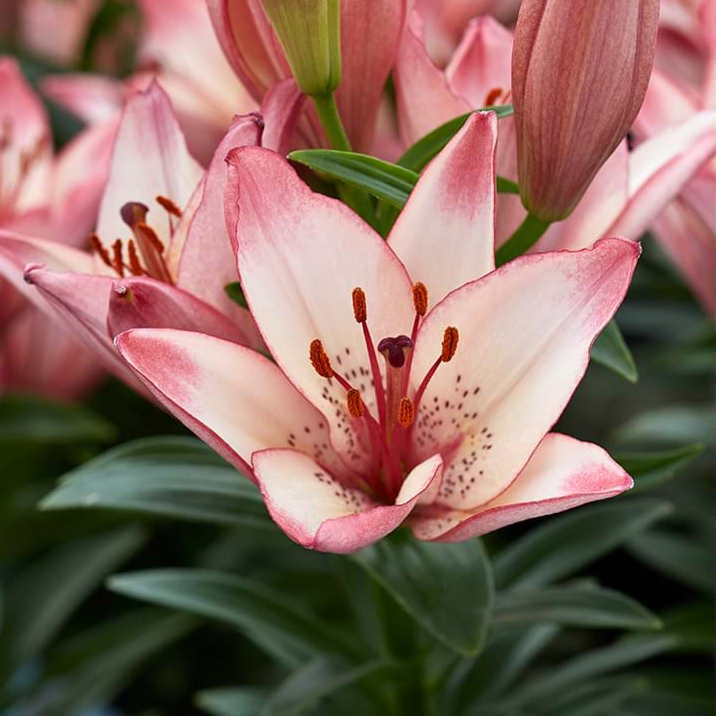Луковицы азиатской горшечной лилии Конфетти Джой (Lilium asiatic Confetti Joy) высаживаются вдоль бордюров или в горшки. Формируют миниатюрные кустики высотой до 35 см. Цветки крупные, в диаметре около 13 см. Окраска ванильная, кончики розовые. Есть небольшой бордовый крап. Тычинки темно-оранжевые. Бутоны вертикальные, распускаются в июне. Лилии хорошо развиваются на дренированных, рыхлых, плодородных почвах. Любят умеренный полив, но без переувлажнения. При выращивании в кашпо рекомендуется добавлять дренаж. Сорт зимостойкий, засухоустойчивый. Не боится вредителей.