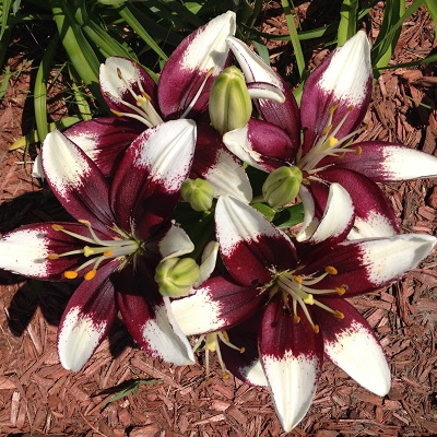 Луковицы азиатской горшечной лилии Тайни Падхай (Lilium asiatic Tiny Padhye) привлекают внимание необычным праздничным нарядом. Окраска контрастная. От центра до середины лепестков идет насыщенный винный оттенок, затем он сменяется чисто-белым цветом. Пыльники оранжевые. Высота стеблей около 35-40 см. Цветки в диаметре до 16 см. Раскрываются полностью, изящно загибая лепестки вниз. Зацветает в июне-июле. Хорошо развивается на солнечных участках и в полутени. Любит умеренный полив. Но заливать растение не рекомендуется, луковицы могут начать гнить. Желательно высаживать на плодородных почвах.