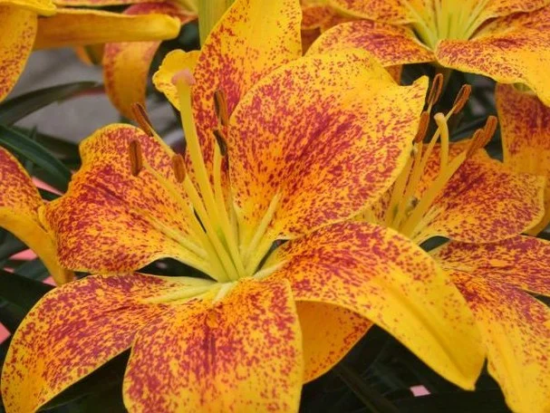 • Окраска цветка : ярко-желтый с густым темно-красно-оранжевым крапом по всему лепестку, на кончиках крап реже и мельче