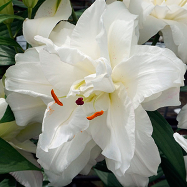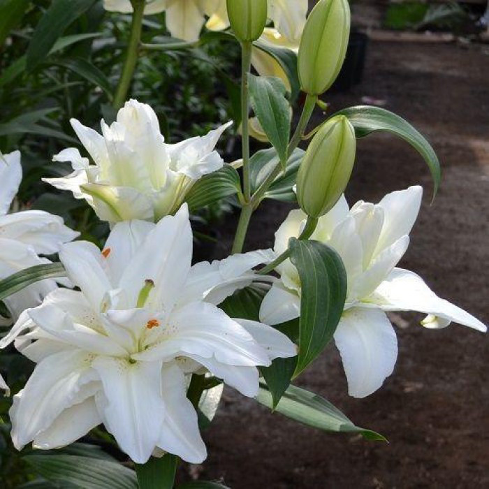 Лилия азиатская махровая сноуборд - это великолепное растение, которое поразит вас своей красотой и изысканностью. Ее стебель достигает высоты до 85 см, а цветки белоснежного цвета с нежными розовыми крапами и мазками по краям лепестков радуют глаз размером до 20 см. Листья лилии имеют уникальную форму, что делает это растение еще более привлекательным.