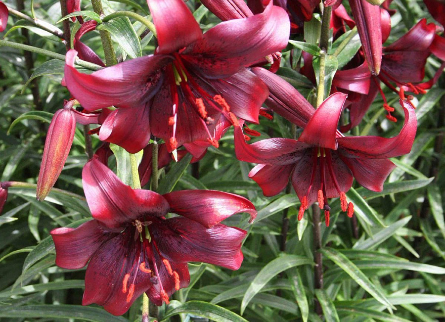 Луковицы лилии азиатской Найт Флайер (Night Flyer) входят в группу «тигровых сортов» азиатских гибридов. Это изящное растение, поражающее утонченной красотой. На высоком стебле распускается до 4 крупных чалмовидных цветков на тонких цветоносах. Их загнутые блестящие лепестки окрашены в насыщенный черно-бордовый цвет. Ближе к центру бутона видны черные вкрапления, похожие на маковые зерна.