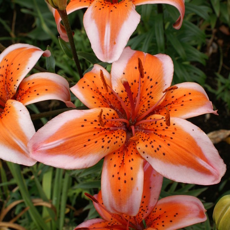 Окраска цветка : Оранжево-апельсиновая с широкой белой каймой по краю, крап