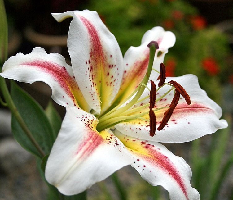 Окраска цветка : снежно-белая с оранжево-красной полосой, красный крап