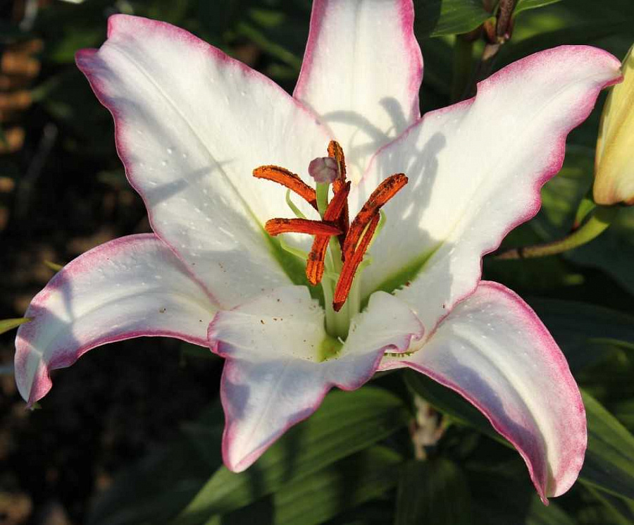 Луковицы лилии восточной Хотлайн (Lilium oriental Hotline) — один из ранних сортов. Период цветения начинается уже в июле и длится до конца лета. Растение выглядит очень эффектным: на длинных стеблях (до 120 см) распускаются крупные цветы, до 25 см в диаметре каждый. Лепестки белые, с контрастным лиловым кантом и яркими красными пыльниками. Цветы сочетаются с любыми композициями и ставят правильные акценты в ярких букетах. Лилия Хотлайн — один из самых морозостойких сортов. Она выдерживает заморозки до –40 градусов, при этом летом отлично растет под открытым солнцем. Если периодически подкармливать ее минеральными удобрениями, ее не нужно будет пересаживать в течение 3–5 лет.