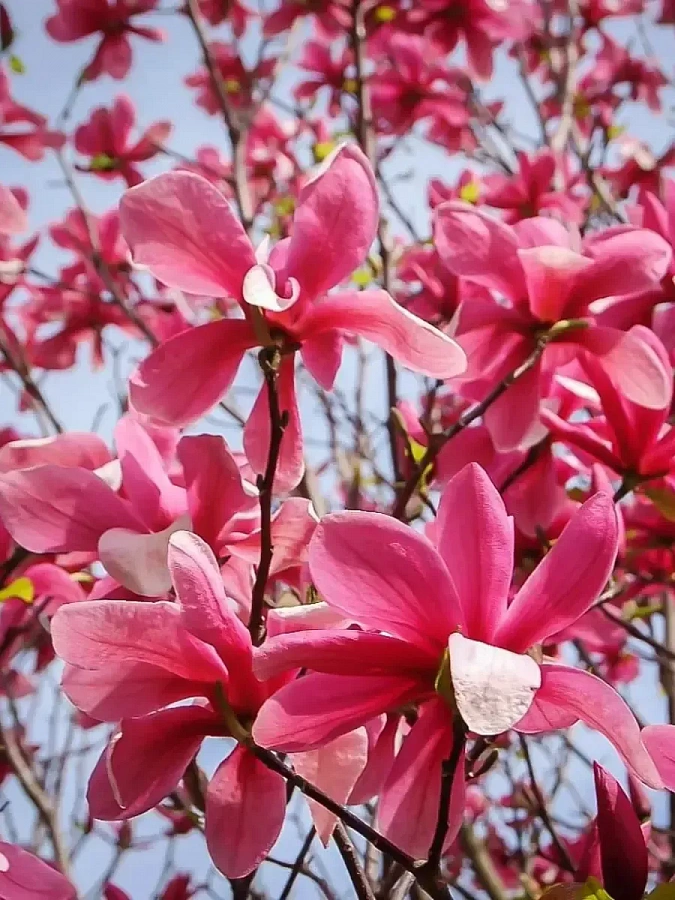 Саженцы магнолии гибридной Гэлакси (Galaxy) довольно быстро вырастают в роскошные деревья, обильно цветущие большими розовыми чашами цветов с нежными длинными лепестками. Высота взрослого растения 3-4 м. Цветение начинается раньше, чем распускаются листья. Бутоны цветков по форме напоминают лилии. Листья глянцево-зеленые, продолговатые. У крупномеров магнолии гибридной Гэлакси раскидистое ветвление и широкая крона.