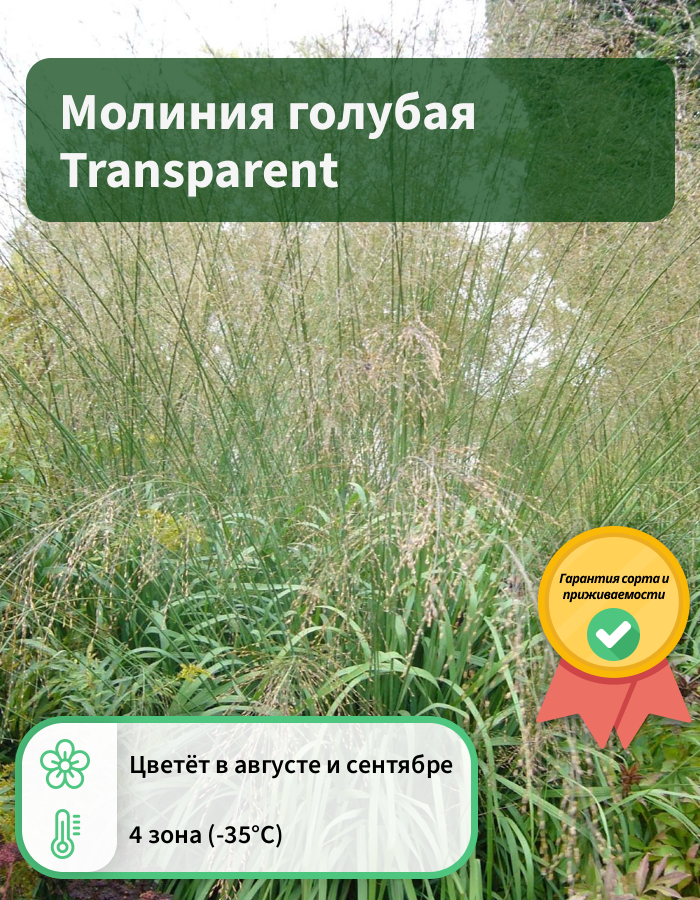 Рассаду молинии голубой Transparent (Molinia caerulea) используют в ландшафтном дизайне для оформления газона, композиций с камнями, береговой зоны, выращивания в контейнерах. Растение в высоту разрастается до 60-90 см. Листья молинии голубой Transparent зеленые или серо-зеленые, до 12 мм шириной, осенью приобретают золотисто-желтый цвет. Зацветает многолетник в августе. Соцветия-колоски ажурные, прозрачные, редкие. Выращивать декоративный злак рекомендуют на сырых, прохладных, полутенистых или полностью затененных местах.