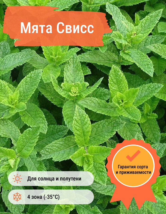 Рассада мяты перечной Swiss (Mentha suaveolens) лучше всего растет на универсальной садовой земле, перемешанной с глиной и песком. Участок для посадки выбирают частично затененный. В открытом грунте растение может достигать до 80-100 см в высоту, но при выращивании в контейнере стебли несколько ниже (40-50 см). Цветет с июля до сентября, является отличным медоносом. Листья вырастают на коротких стеблях, продолговатые, яйцеобразные, короткочерешковые, с заостренным краем. Верхняя часть темно-зеленого цвета, нижняя немного светлее. Невзрачные мелкие цветки создают колосовидные соцветия, растут на кончиках побегов. Сорт мяты перечной Swiss отличается свежим лимонным ароматом с бодрящим эффектом.