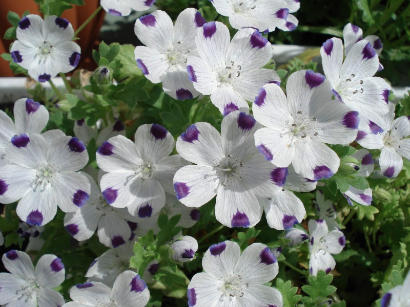 Семена  немофилы пятнистой (Nemophila maculata) Божья коровка высевают в открытый грунт в апреле, и уже в июне любуются красивоцветущей полянкой. Однолетнее почвопокровное растение низкое, высотой до 20 сантиметров. Стебли разветвленные, полустелющиеся. Листья перистолопастные, опушенные. Нежные цветки немофилы пятнистой похожи на крупные лютики. На конце каждого белого лепестка имеется по одному синему или лиловому пятнышку, отсюда и оригинальное название сорта — «Божья коровка». Любит полутень и влажную почву. Особенно эффектна в бордюрах, в подвесных контейнерах и вблизи водоемов.