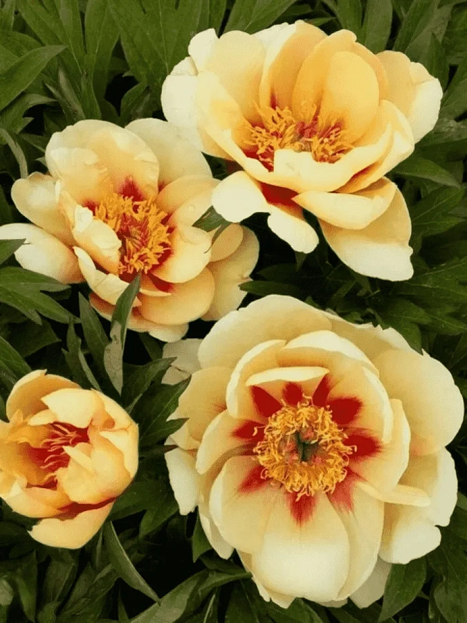 Рассада пиона ИТО Бордер Чарм (Border Charm) без сомнений, самый элегантный сорт из желтых гибридов. Полумахровые цветки с красными основаниями сразу обращают на себя внимание. Диаметр соцветий 16 см. Высота взрослого растения достигает 90 см. ИТО-гибридный сорт вобрал в себя все стойкие качества: высокую морозостойкость и прочность побегов. Цветы долго стоят в срезке. Особенности пиона Бордер Чарм: