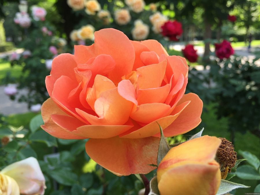 Саженцы розы чайно-гибридной Дорис Тистерман вырастают до двух метров, но если регулярно производить обрезку, то высота не превысит полутора метров. Ширина куста составляет примерно один метр. Цвет роз – ярко оранжевый, иногда с вкраплениями кремовых оттенков. Диаметр бутона достигает 9 см, он излучает приятный аромат, имеет необычную бархатную форму лепестков. Куст цветет два раза в год. Интенсивный уход нужен только в первое время после посадки, он включает в себя подрезку побегов, чтобы регулировать высоту и ширину растения, регулярный полив и подкормку удобрениями. Высаживать нужно на хорошо освещенном участке сада.