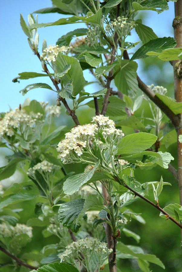 Саженцы рябины круглолистной Магнифика (Magnifica) вырастут в компактные тонкие деревья, очаровательно цветущие белыми венчиками. Высота взрослого растения не превышает 15 м. Цветение начинается в мае. Листья темно-зеленые, ребристые, овальной формы. Крона крупномера напоминает колонну. Рябина круглолистная Магнифика плодоносит красивыми кистями ярко-красных ягод.