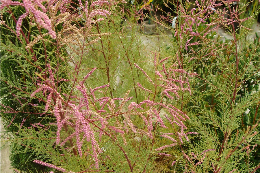 Эффектный пряморастущий кустарник, до 3 м высотой, с тонкими, сизоватыми или зеленоватыми ветвями и красноватыми однолетними побегами. Листья узкие, шиловидные, до 1,5 мм длиной, с концами загнутыми к побегу. Цветки розовые, в густых, сложных кистях, до 30 см длиной. Цветет с июня по сентябрь.