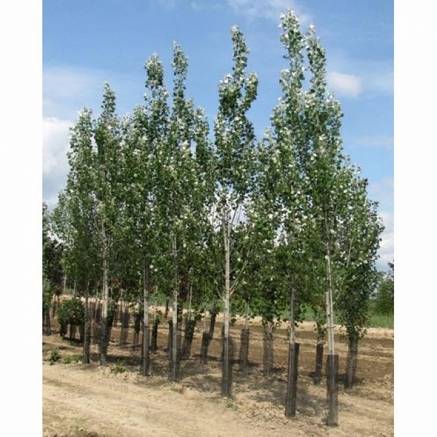 Саженцы Тополя белого Ракет (Populus alba) хорошо растет в европейской части России, Западной Сибири, Ближнем и Среднем Востоке и хорошо размножается черенками. На толстом темном стволе растут зеленые побеги. Листья имеют волнистый край и легкий белого пушок снизу. Светолюбивое дерево комфортнее всего чувствует себя в легкой дренированной почве на хорошо освещенном участке. Морозостойко и легко переносит избыток влаги. Многолетник начинает цвести уже в начале мая, однако плодоносит только в середине июня. Декоративное дерево можно использовать для посадки в солитерах, а также для создания аллейных рядов.