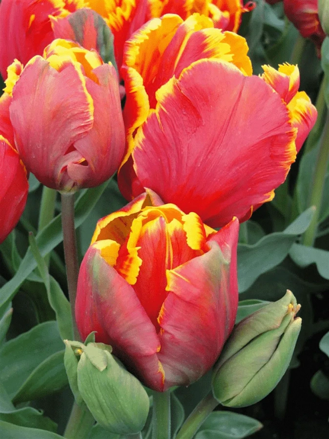 Тюльпан попугайный Брайт Пэррот - это настоящий художник среди цветов! Его крупные алые цветы с широкой ярко-желтой каймой напоминают огненных попугаев, развевающих свои перья на ярком солнце. Этот тюльпан поражает своей красотой и оригинальностью, привлекая внимание всех окружающих.