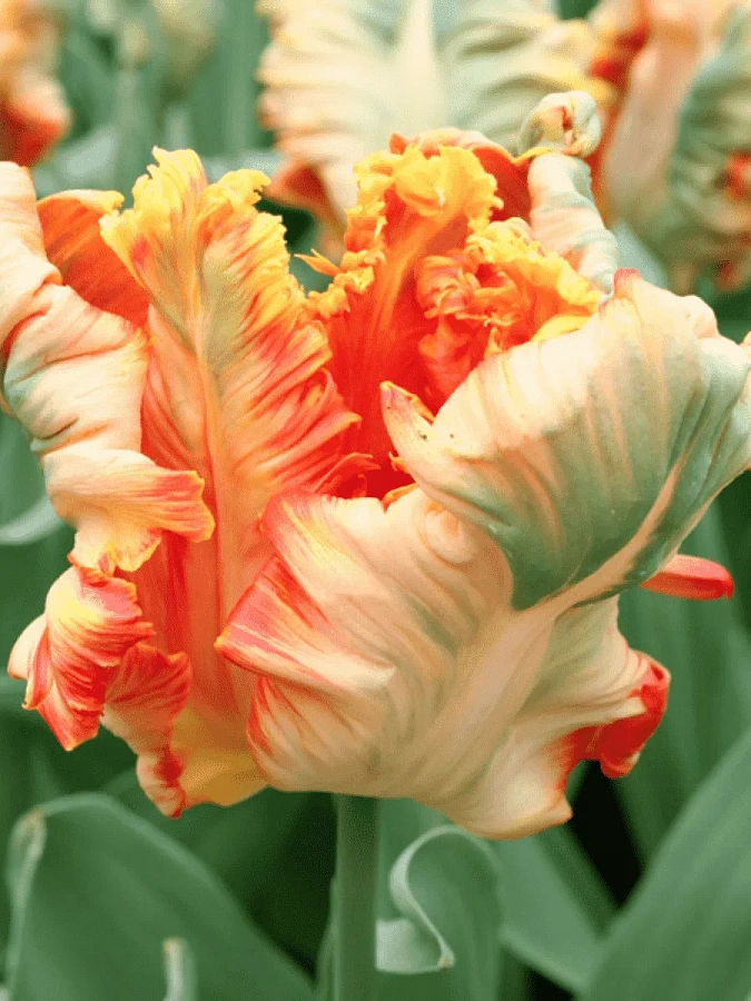 Тюльпан попугайный Пэррот Кинг - это настоящий король среди цветов! Его кремово-желтые цветы с оранжево-красными краями и зелеными штрихами в центре привлекут внимание каждого, кто пройдет мимо вашего сада. Этот тюльпан достигает высоты до 50 см и цветет в мае-апреле, радуя глаз своим ярким и необычным видом.