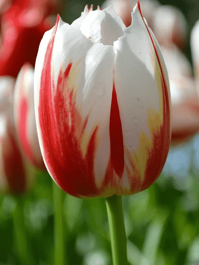 Тюльпан Триумф Хэппи Дженерейшн - это великолепное растение с белыми цветками, украшенными красными и жёлтыми штрихами. Его стебель достигает высоты до 50 см, что делает его идеальным выбором для групповых и одиночных посадок. Листья тюльпана имеют травянистую форму, а его цветы радуют глаз в мае и апреле.