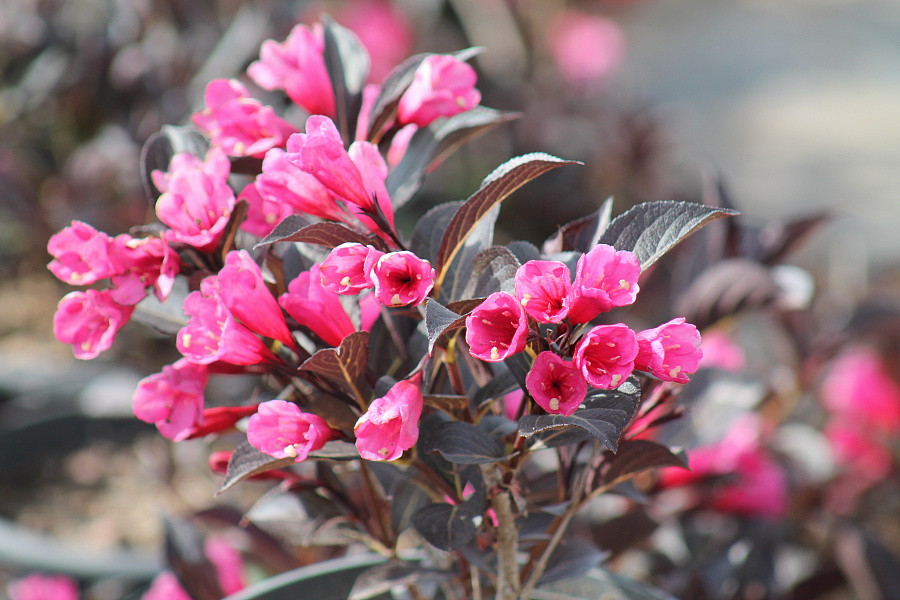 Саженцы вейгелы цветущей Александра (Alexandra) подарят саду декоративный лиственный кустарник с густой кроной шаровидной формы. Сорт очень популярен благодаря сочетанию ярких красно-розовых воронковидных цветочков с бордовой листвой. Обильное цветение приходится на июль, но в меньшем количестве привлекательные цветки могут появляться до сентября. Крупномеры приживаются на любых садовых почвах с достаточным уровнем влаги и солнечного света. Вейгела цветущая Александра хорошо отзывается на формировочную обрезку, которую стоит проводить не чаще одного раза в пару лет.